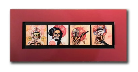 This was taken into consideration by a client of ours who brought in Star Wars art painted on wood panel. Because of the warm tones, Bryan (not his real name) wanted to accent the works' warmth and elected to mat the work with a red color.